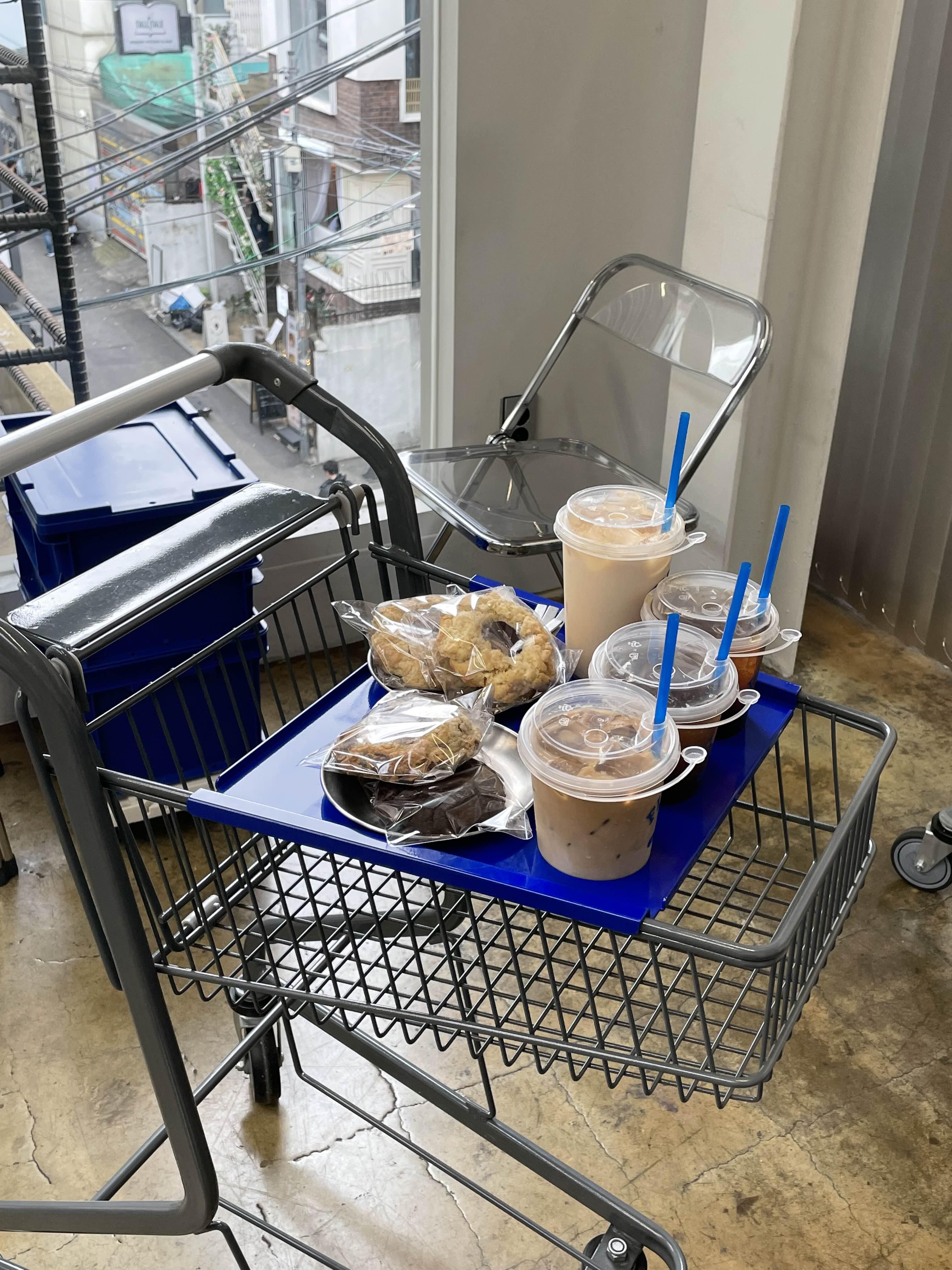 카트 위에 음료와 디저트를 올려