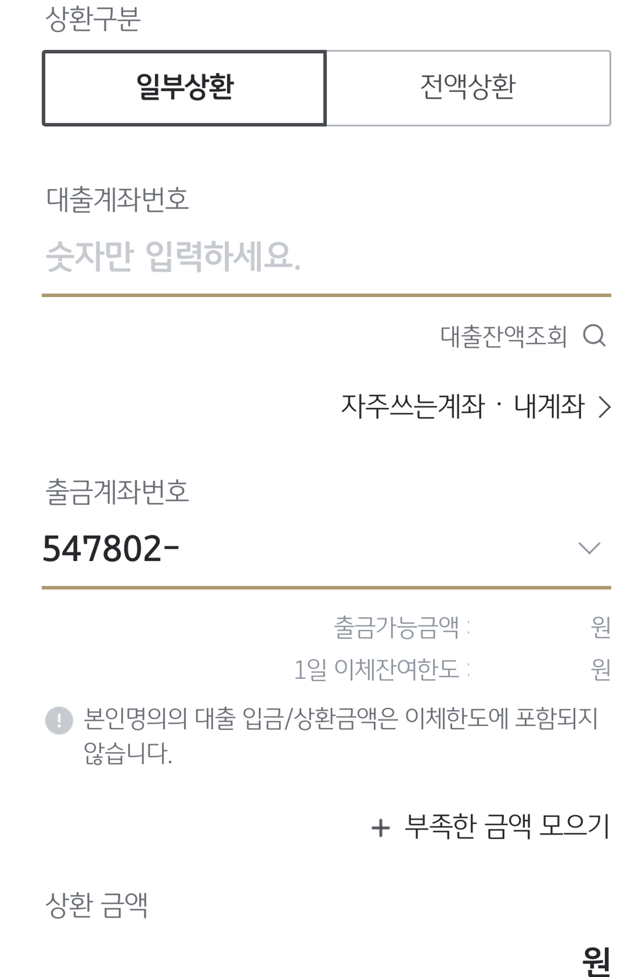 대출 계좌, 출금계좌 설정, 상환 금액 입력하고