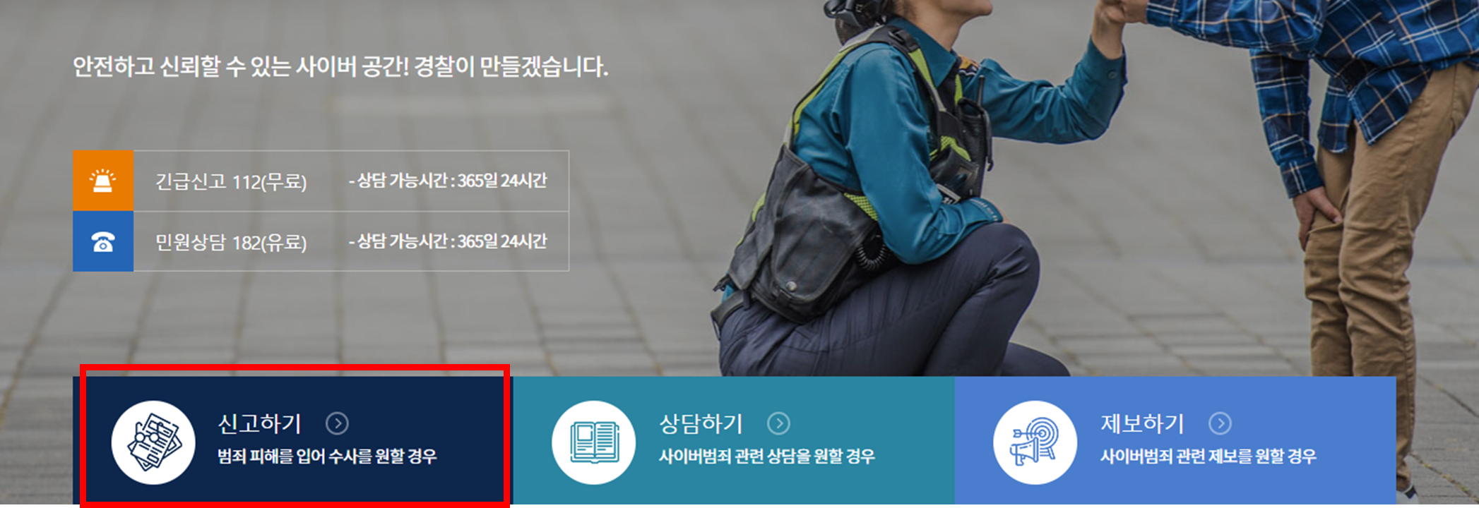 신고는 피해자 본인만 가능합니다. 가족 등 대리인은 경찰서를 직접 방문하시거나 대리인 신고가 가능한 국민신문고를 이용해 주시기 바랍니다. 발견한 사이버범죄는 '제보하기'를 이용해 주시