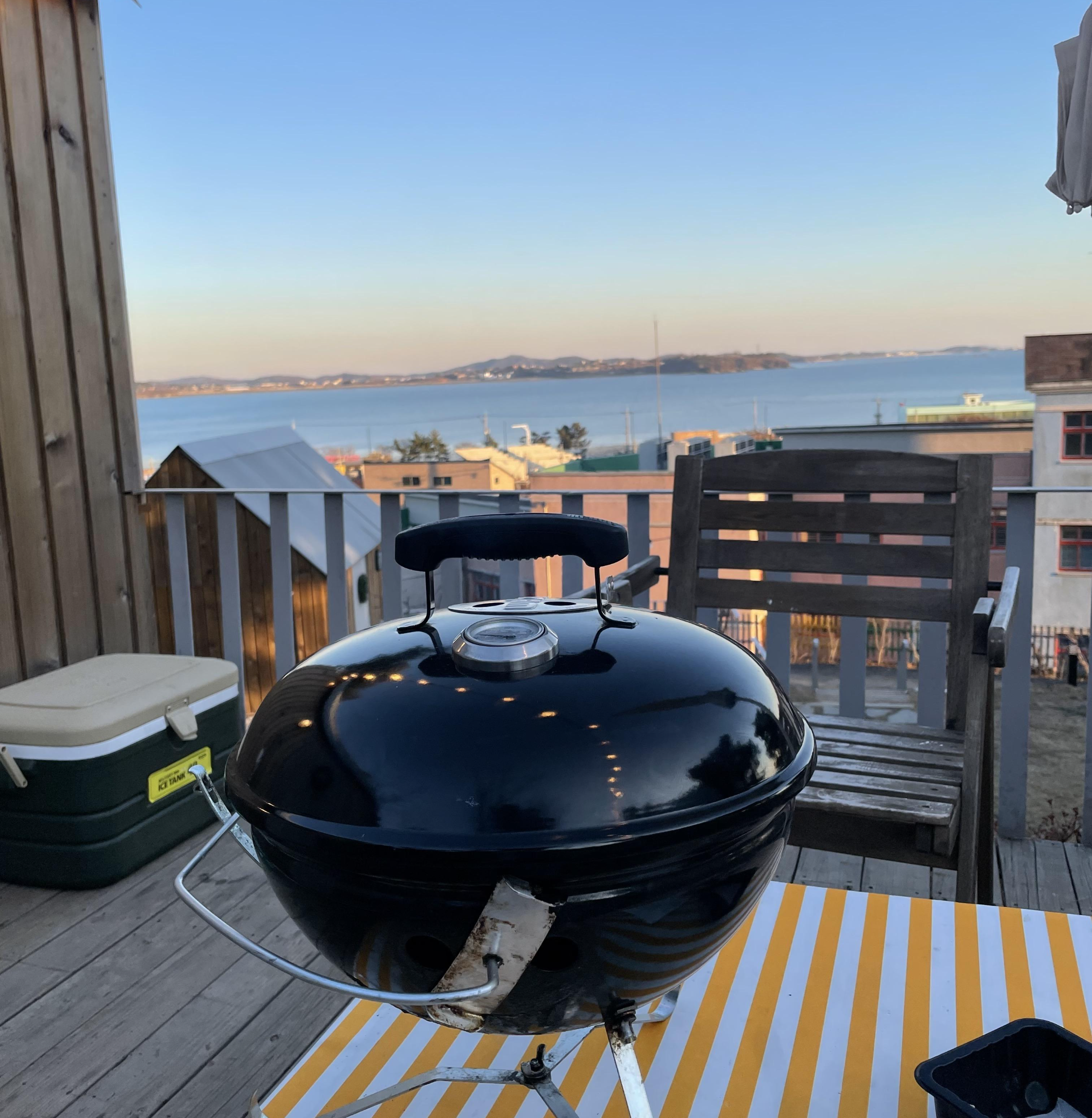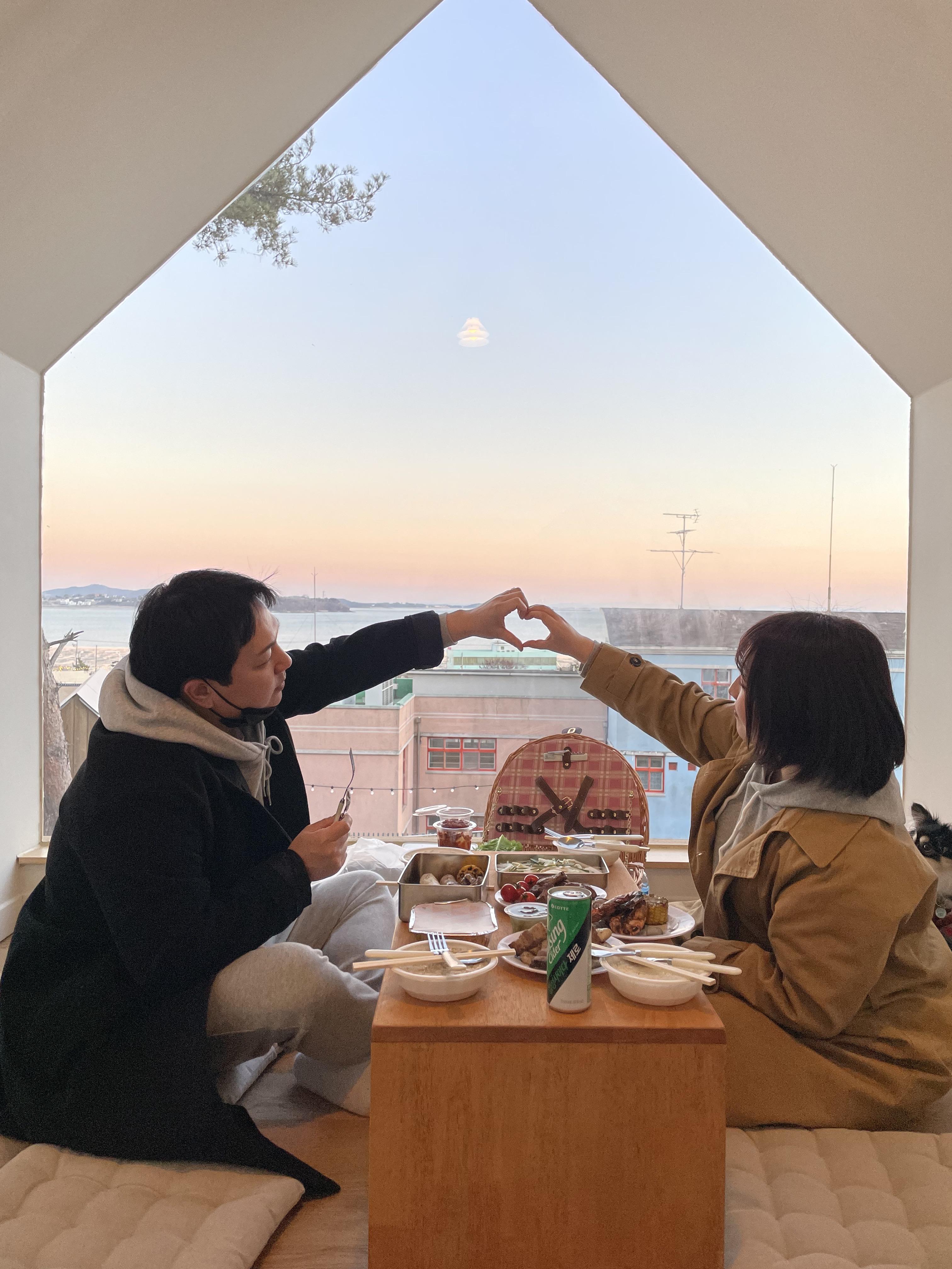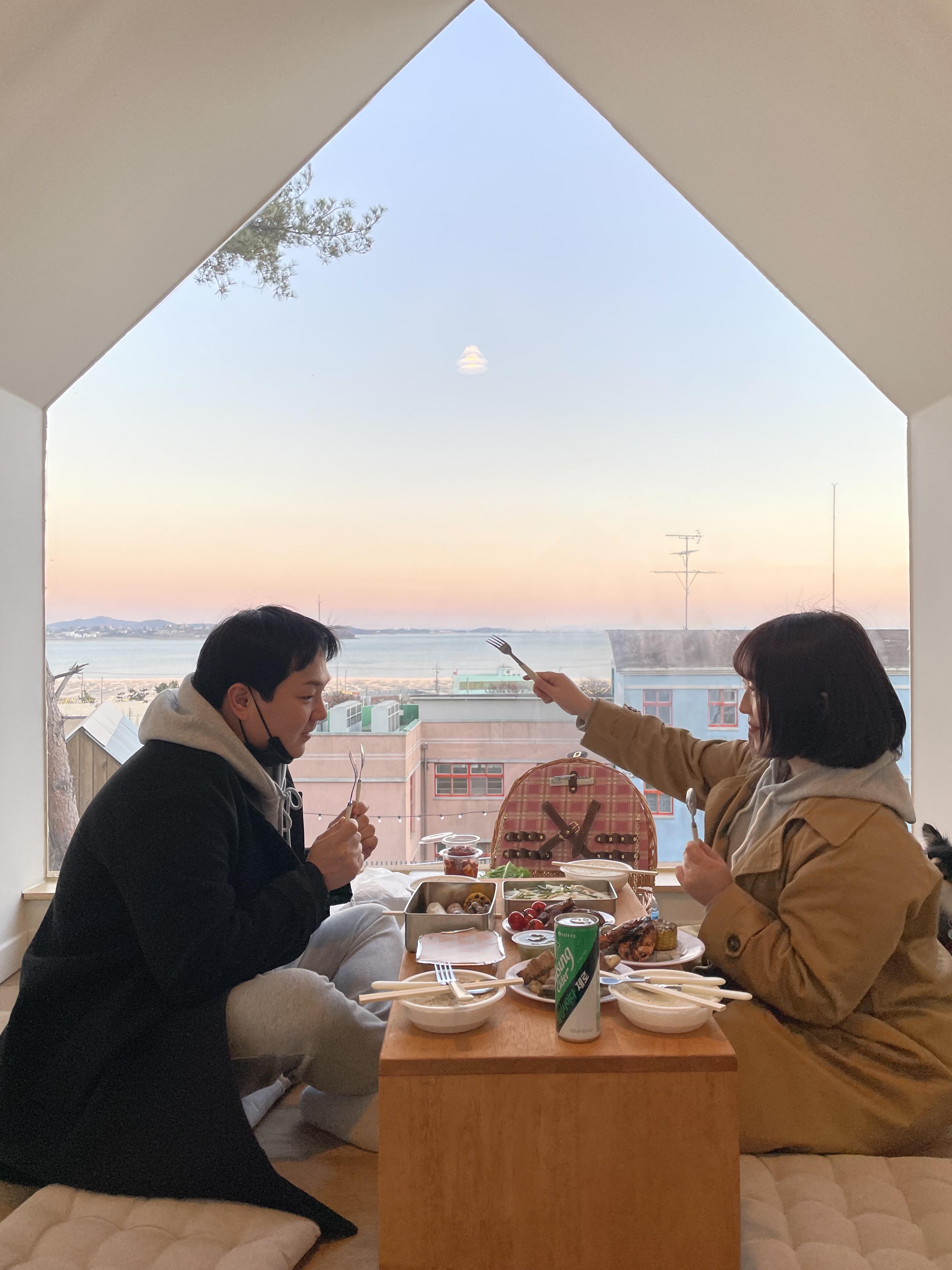 해 지기 전에 따뜻한 고기 한상과 찰칵!